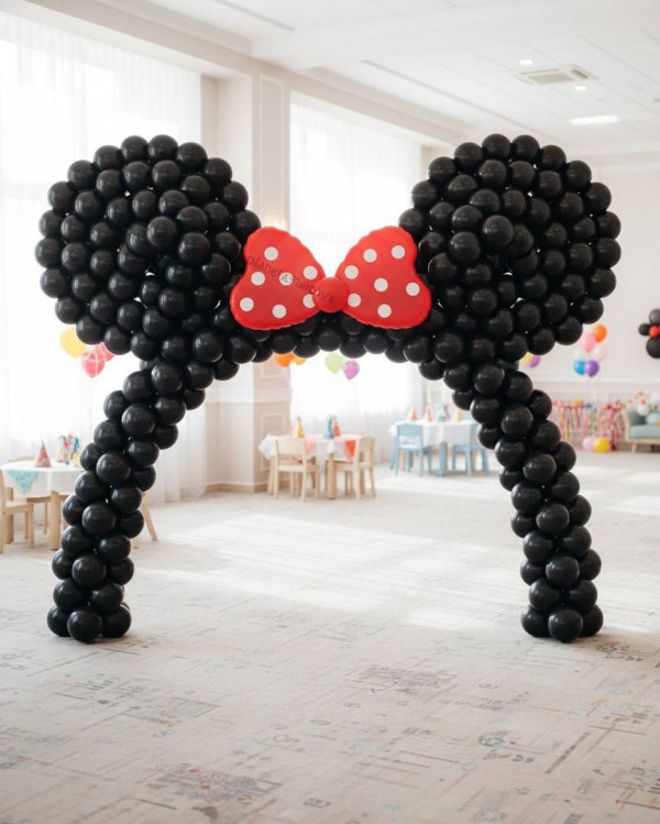 Красный кокетливый бантик в центре арки придаст любому залу праздничное настроение. Каждая девушка будет рада такому подарку: интересная и кокетливая Минни Маус  отличный пример для подражания. Также арка из шаров порадует всех, кто увлекается комиксами – ведь в России очень долго выходил журнал с одноименным названием.