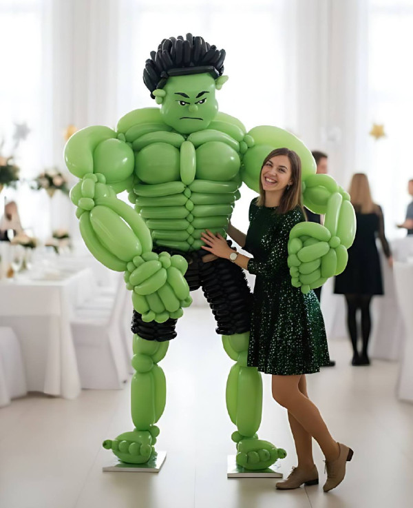 Судьба этого популярного персонажа трагична и поучительна. Зрители переживают каждый его шаг, беспокоятся вместе с ним, как бы иная его сущность не вышла случайно из-под контроля. Халк, выполненный из воздушных шаров, полностью безопасен. К нему может подойти каждый, а уж от желающих сделать селфи с этой фигурой наверняка не будет отбоя, что сделает ваш праздник ещё более оригинальным и привлекательным.