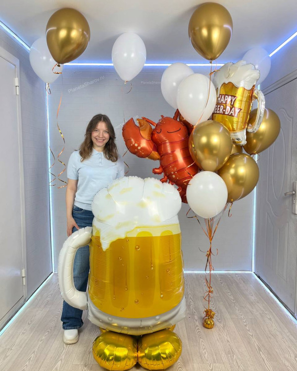 Хотите оригинально поздравить коллегу, мужа, брата или друга… тогда «Кружка пива из шаров» станет отличным сюрпризом и прекрасным украшением мероприятия. Данная композиция очень точно повторяет очертания настоящего пенного напитка, который украшен своим неотъемлемым «спутником» красным раком. Этот необычный подарок, который выполнен из гелиевых шариков, по достоинству оценят истинные ценители пива, а гости, несомненно, обратят внимание на оригинальность и красивое исполнение.