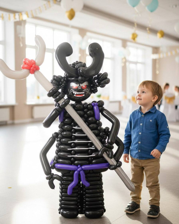 Лорд Гармадон из Лего Ниндзяго из воздушных шаров представляет собой точное воспроизведение знаменитого героя конструктора. В руках он сжимает мощное мега-оружие. Злобное лицо выражает готовность к атаке. Сложное переплетение черных глянцевых шаров подробно отражает детали костюма.
