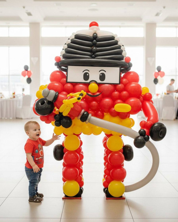Ростовая фигура робокара практически полностью повторяет оригинал, за исключением одного момента: она сделана из маленьких воздушных шариков. Наши аэродизайнеры всегда стараются максимально точно передать особенности персонажа, его характер. И, конечно, учесть все тонкости дизайна помещения, где фигура робота в виде пожарного будет установлена. Ведь важен не только внешний вид куклы, но и общее впечатление от зала!